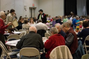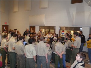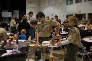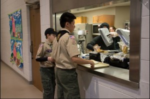 On the day of the breakfast, all scouts and at least one parent from each family arrive at the church at 6:00 AM. We start preparing food and feed all volunteers before opening the breakfast to customers at 7:00 AM. During the pancake breakfast, parents are responsible for all food preparation and scouts serve food and clean tables.