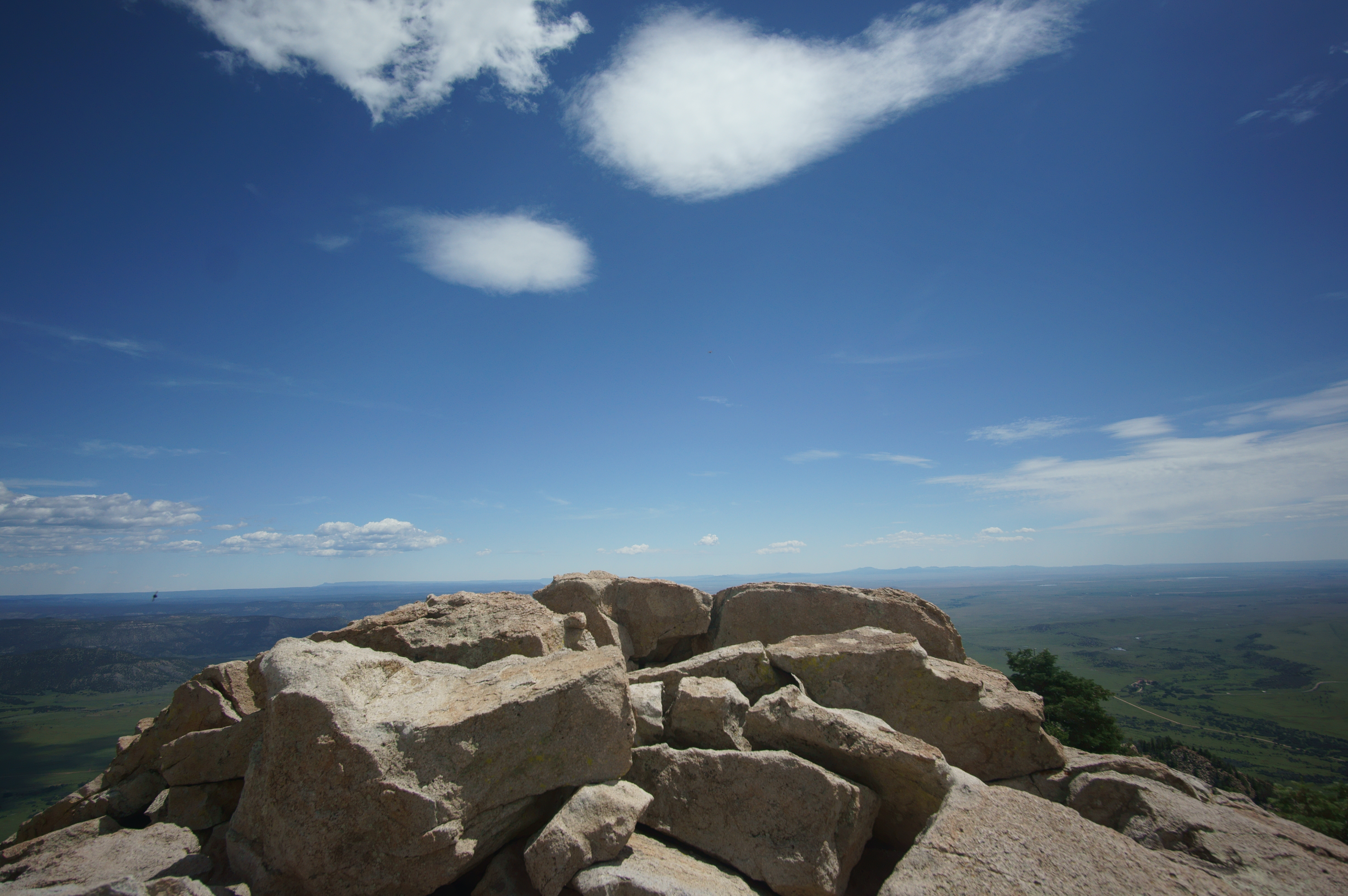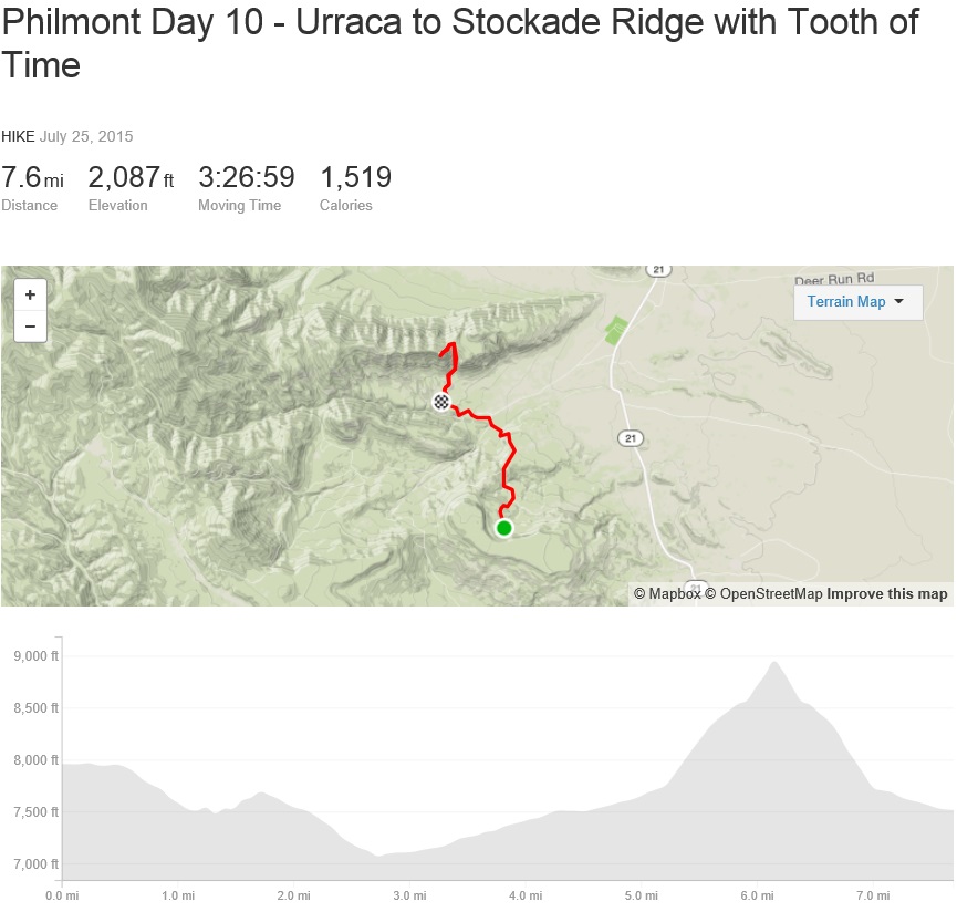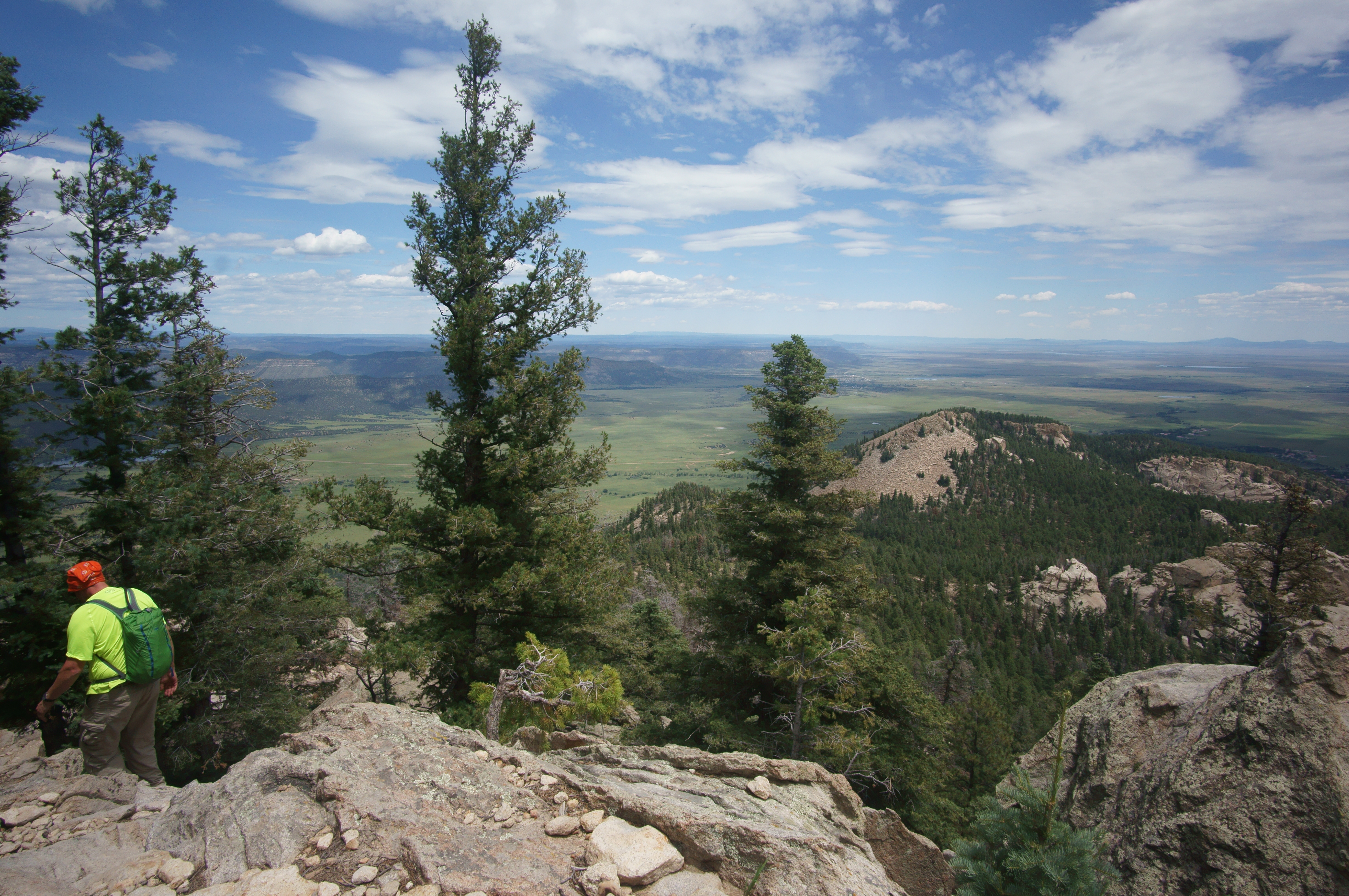 This morning some of the crew got up before sun rise to hike to inspiration point to see the sun rise. Then the boys did the challenge course with the staff. After that we started our hike to the Stockade Ridge trail camp and the Tooth of Time. The hike to Stockade Ridge was 4.5 miles all up and down through brush and fields of sun flowers. The weather was sunny and hot. We set up camp and got some rest before heading up to the tooth of time. At 3:30 we started out for the climb up the tooth. It was about an two hour climb. The last part was a scramble up a slope made up of very large rocks. When we got to the top there was an awesome view of Philmont and the surrounding area. It was something to look back north and see Mt Baldy some 40+ miles away and realizing that we had hiked all that way and then some. Being on top of the tooth was a little scary knowing that it was a sheer drop on three sides and the area at the top is only about 20 square yards. After enjoying the view and taking lots of pictures we headed back down. It was a challenging scramble that really tested the soles of your boots. We safely made it back to camp and prepared our last dinner of the trek. Today we hiked 7.6 miles and climbed 2,086 vertical feet. Tomorrow is our last day on the trail.