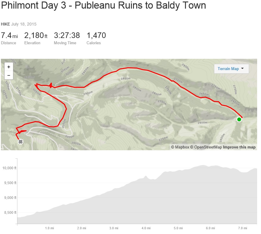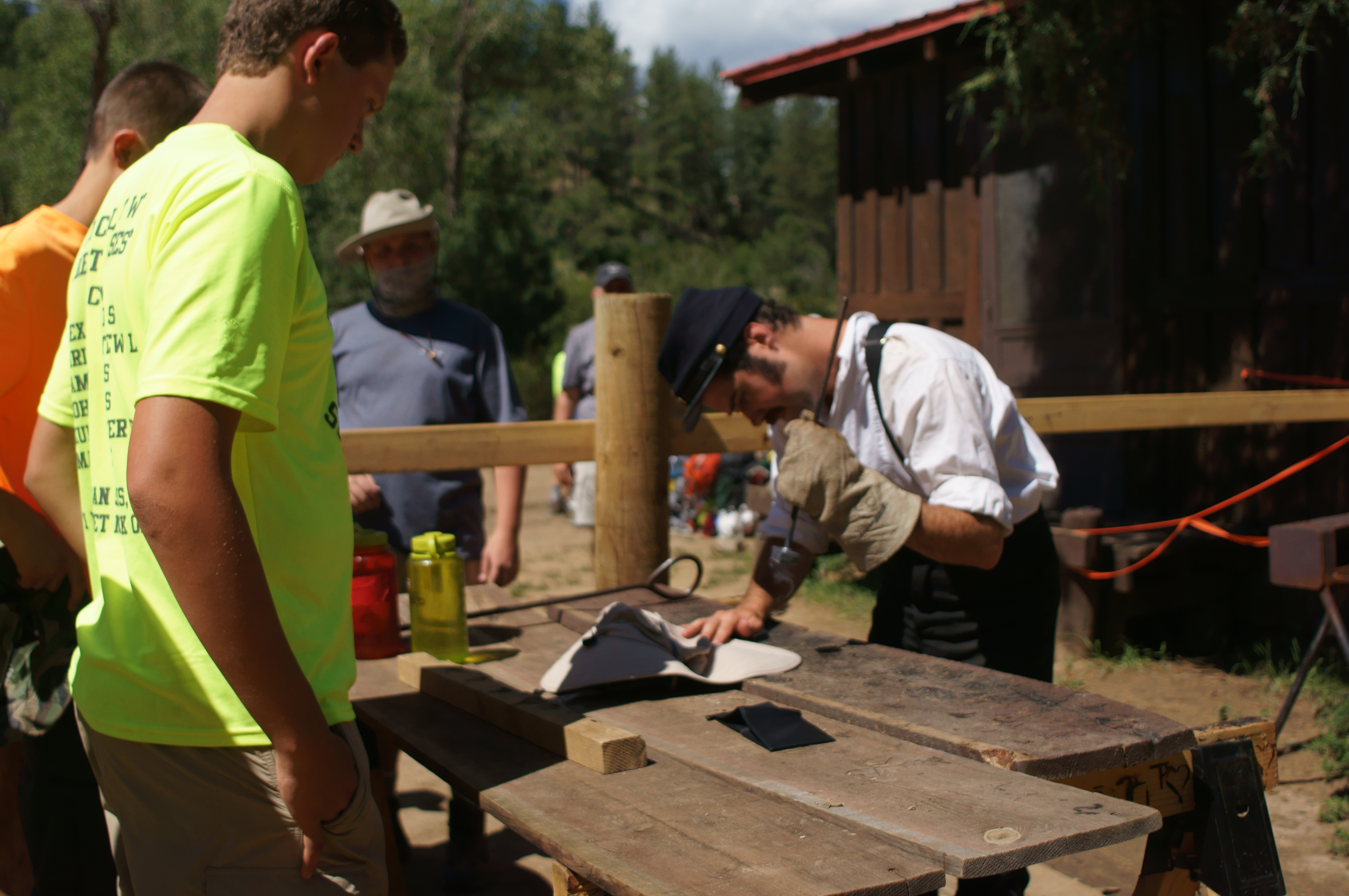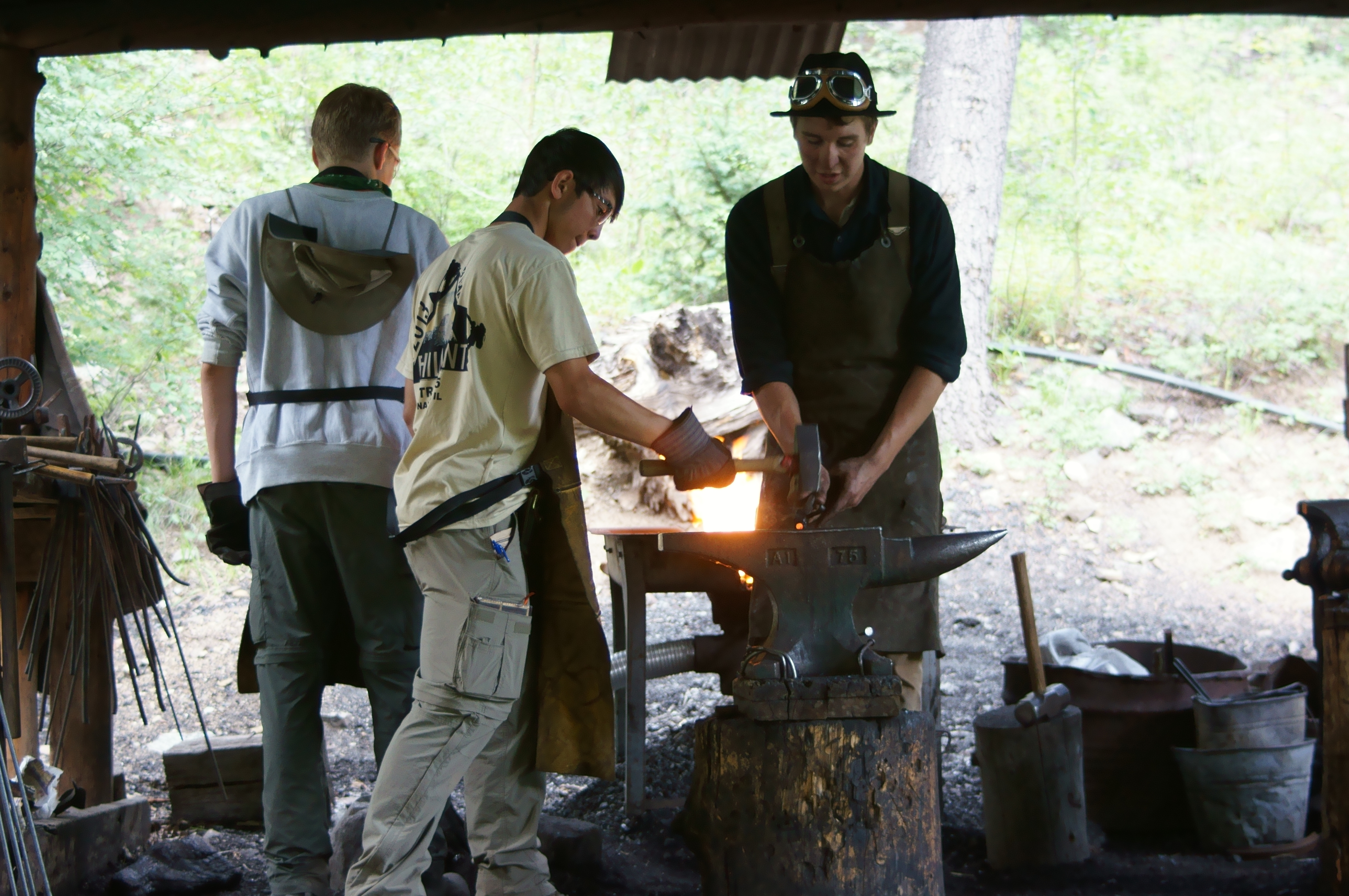 Took 1.5 hours to break camp. Left Pueblano Ruins camp site at 8:00 am. Mr. Snyder returned to base camp with Ranger Adam to rest and acclimate to the altitude. Hopefully we will see him in a few days when he is better. We hiked the five mile climb to the staff camp at French Henry where the boys got to try blacksmithing and tour an old gold mine. Then we hiked to Baldy Town where we camped the next two nights. The camp sites at Baldy Town were not very nice. They were on a considerable slope and full of rocks and downed trees. The only good part about staying at Baldy Town is that it is at 10,000 feet which shortens the climb to the top of Mount Baldy (12,440 ft). The hike from Pueblano Ruins to Baldy Town was 7.2 miles with 2180 feet vertical. We got food supplies for the next three days at the Baldy Town staff camp.
