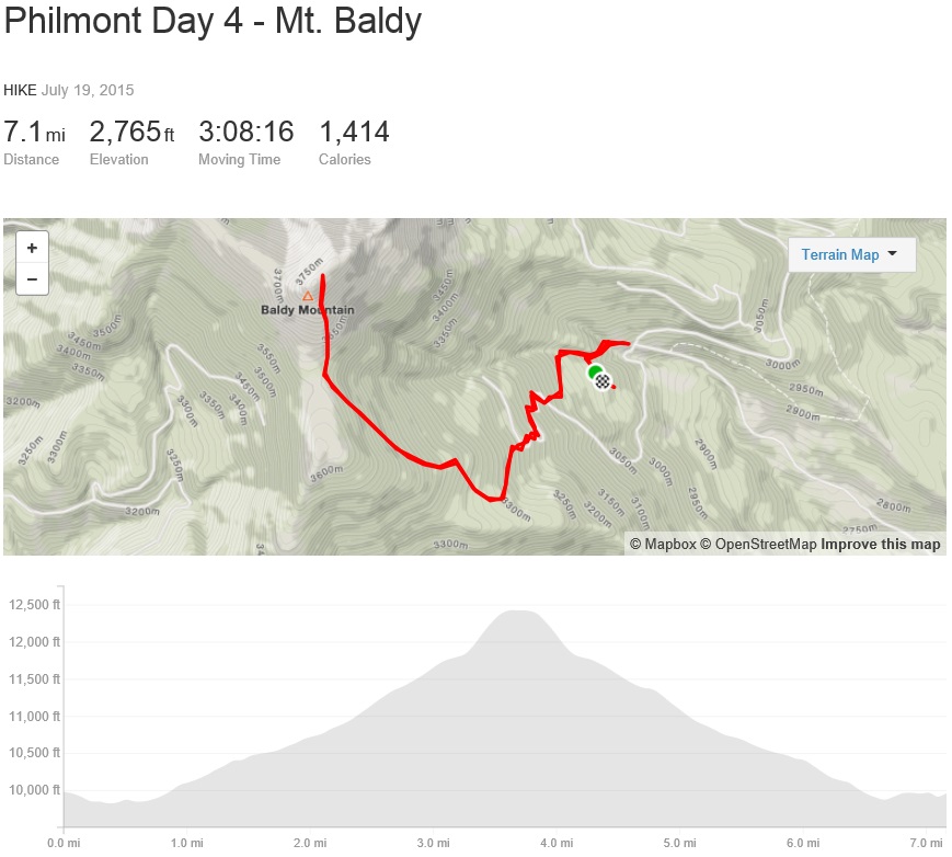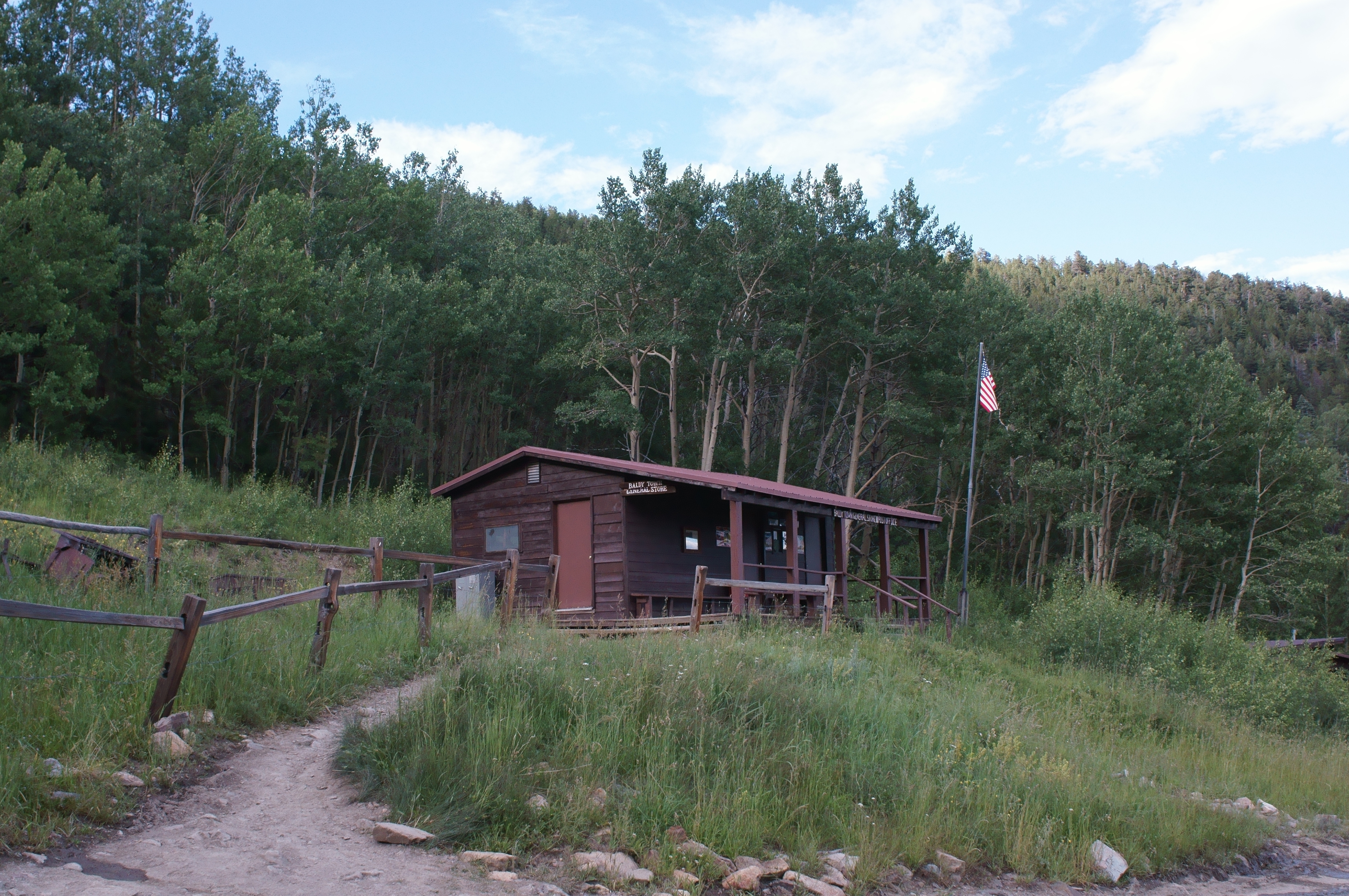 The crew climbed Mt. Baldy today. We got a break with the weather because yesterday was cloudy and rainy. Today is totally clear skies and relatively warm weather for this altitude. One scout was feeling ill today so I stayed down at the Baldy Town staff camp with him. The rest was welcome and I got to take a shower and do laundry. In addition I got to spend a lot of time in their small gold mining museum which documents the history of the gold mining that took place around Mt. Baldy. The crew returned from their summit climb in the early afternoon. They hiked about 7.1 miles and climbed 2,764 feet in about three hours. The climb at the top was especially difficult because of the loose scree near the top. We also got resupplied with food at the Baldy Town commissary.