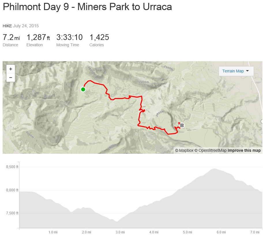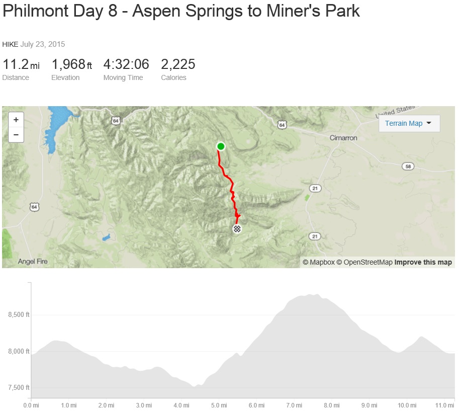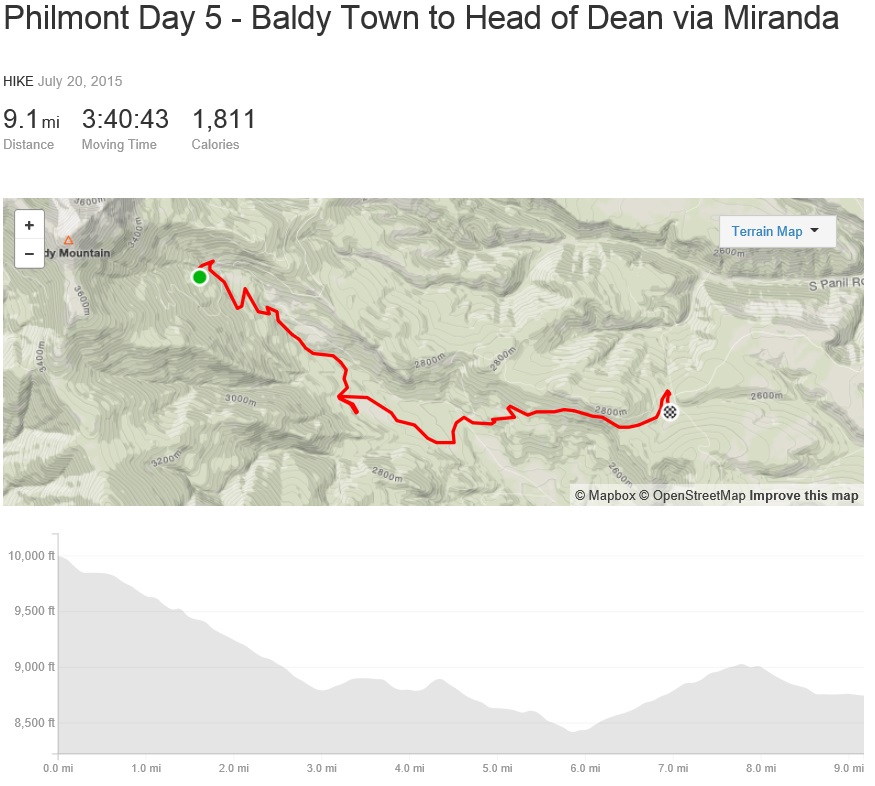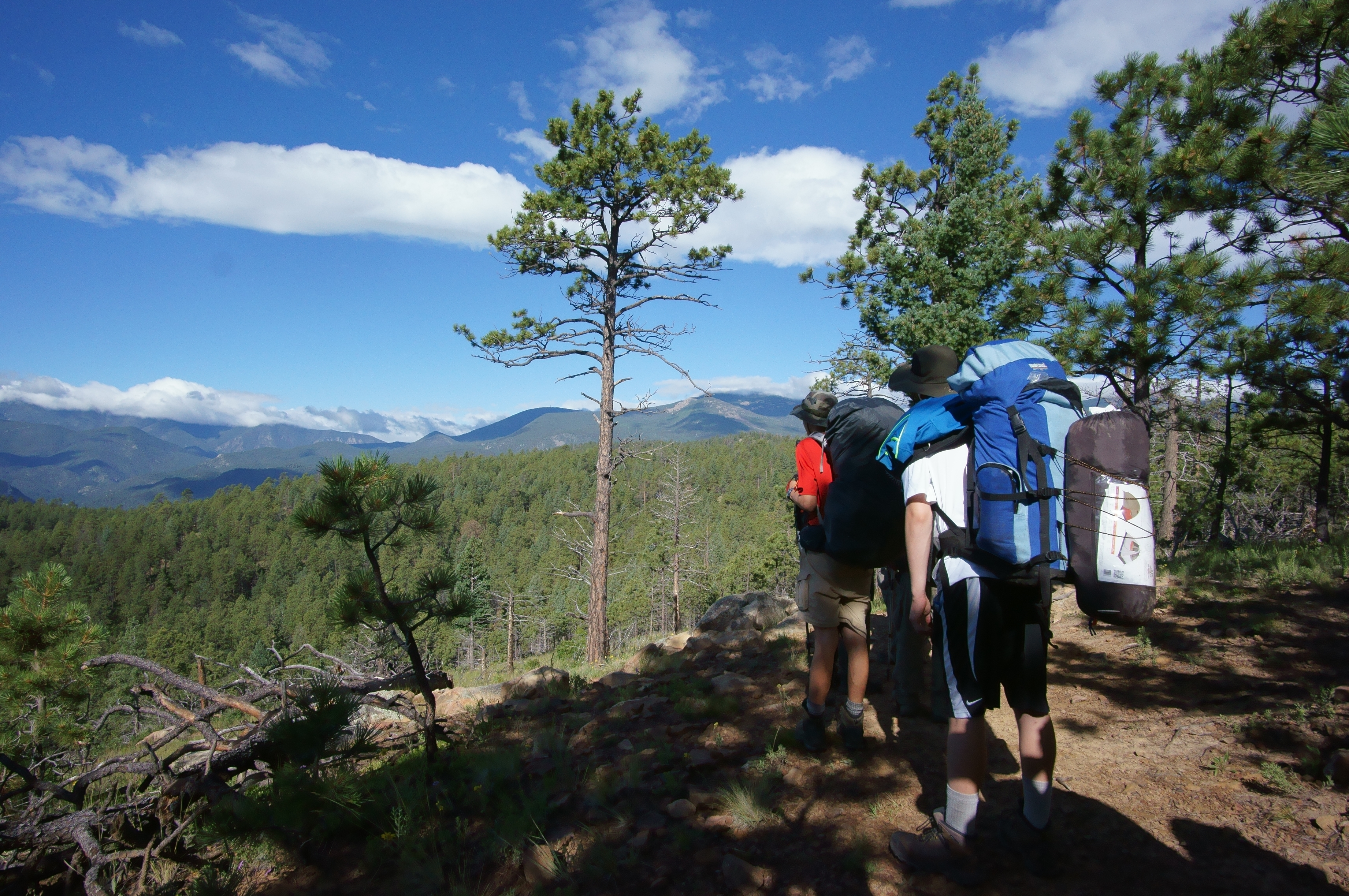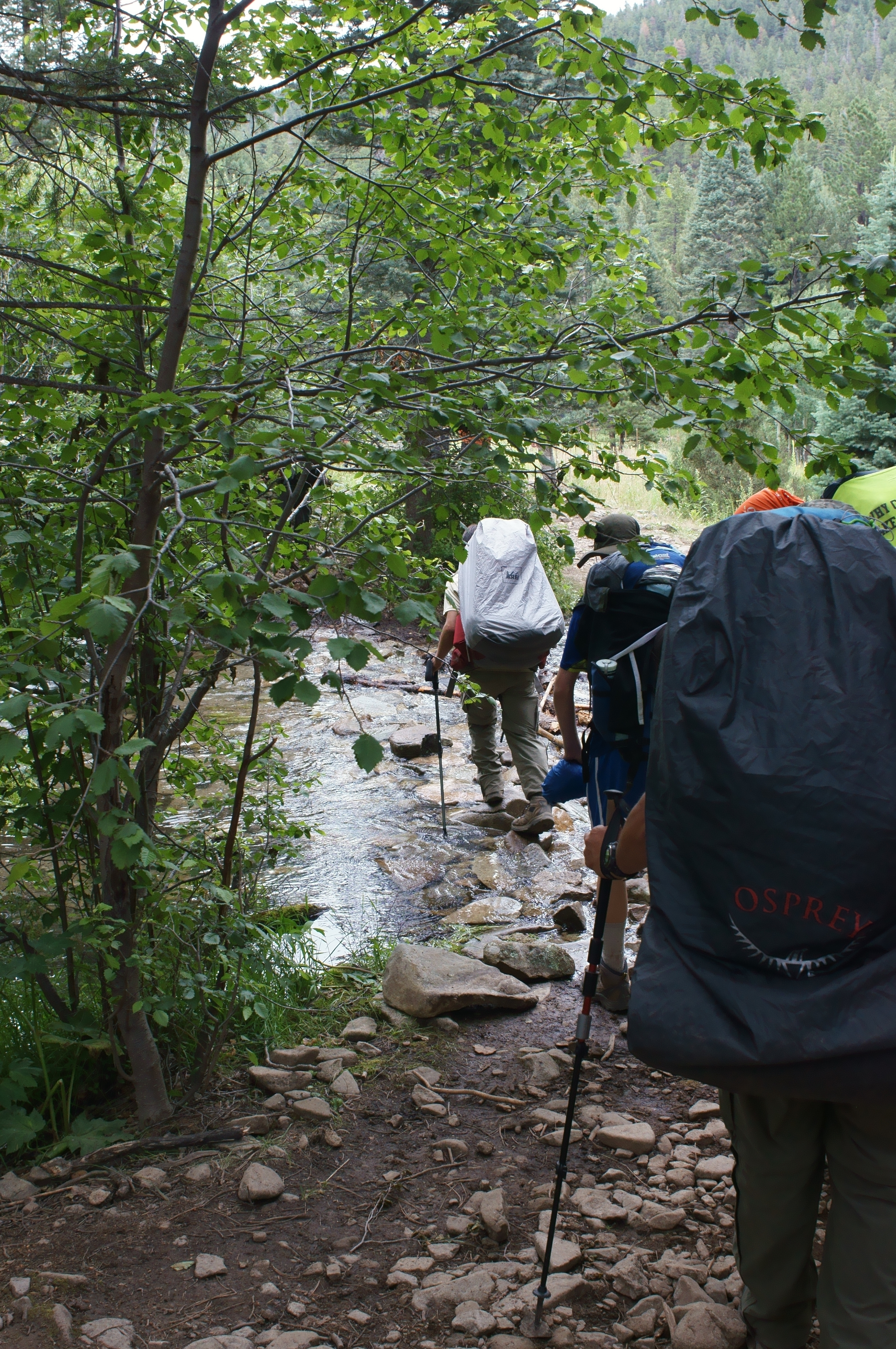 Only a short hike, 2.3 miles and 500 ft vertical, from Ponil Turnaround to the Dean’s Cutoff camp sites. Set up camp in one of the few sites that were not damaged in the flash floods. Did more training with Ranger Adam on camp setup, bear bag procedures, cooking and cleanup. Had lots of time to explore the camp, take a nap, rinse off in the creek and relax.