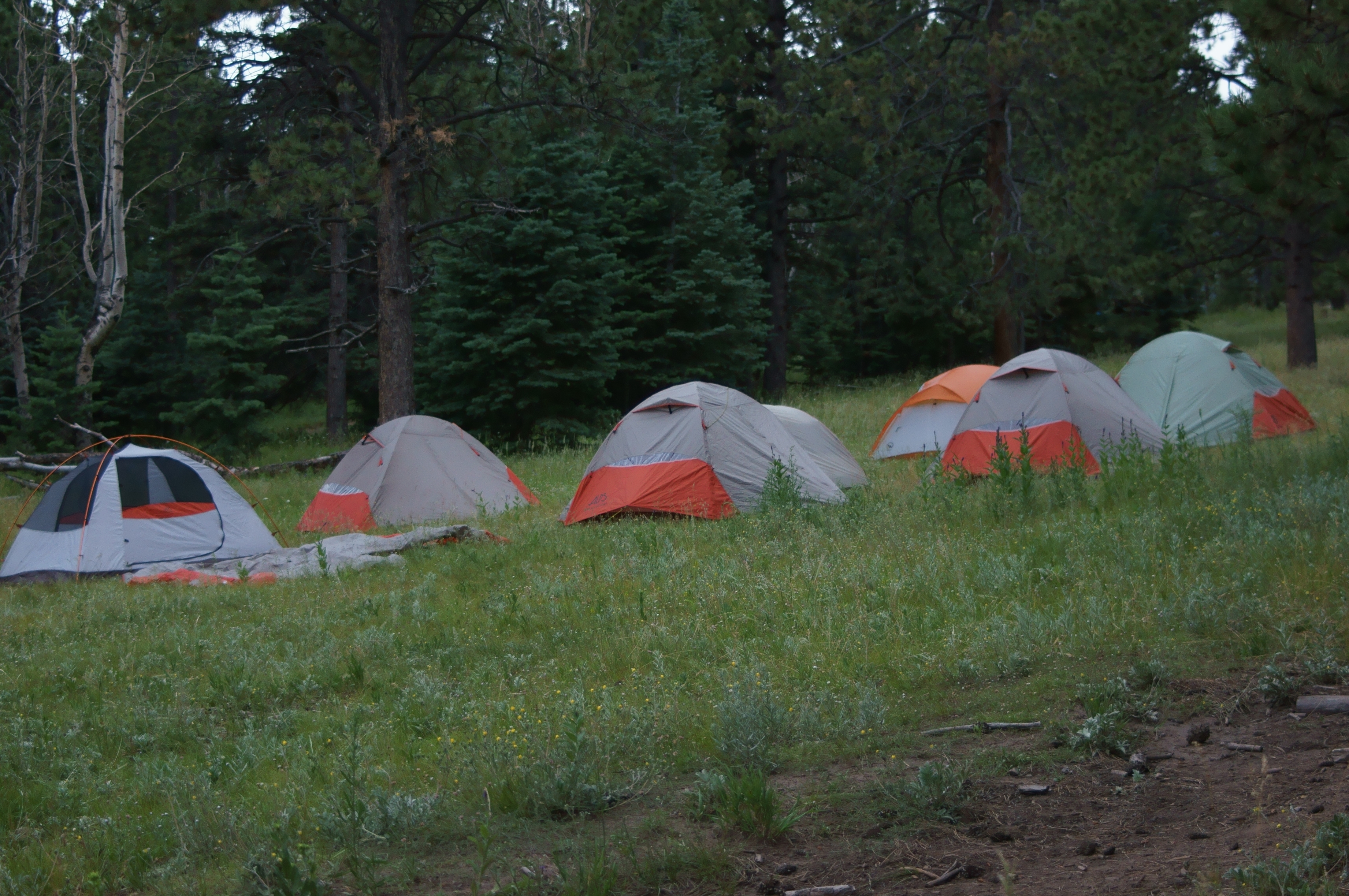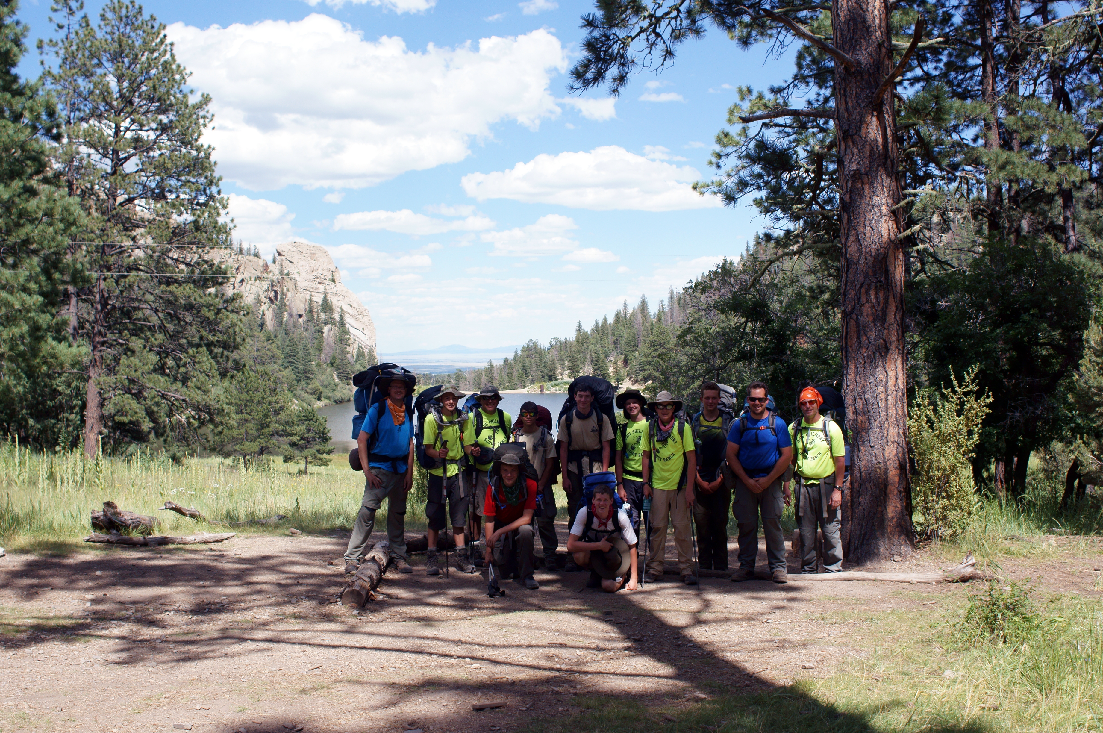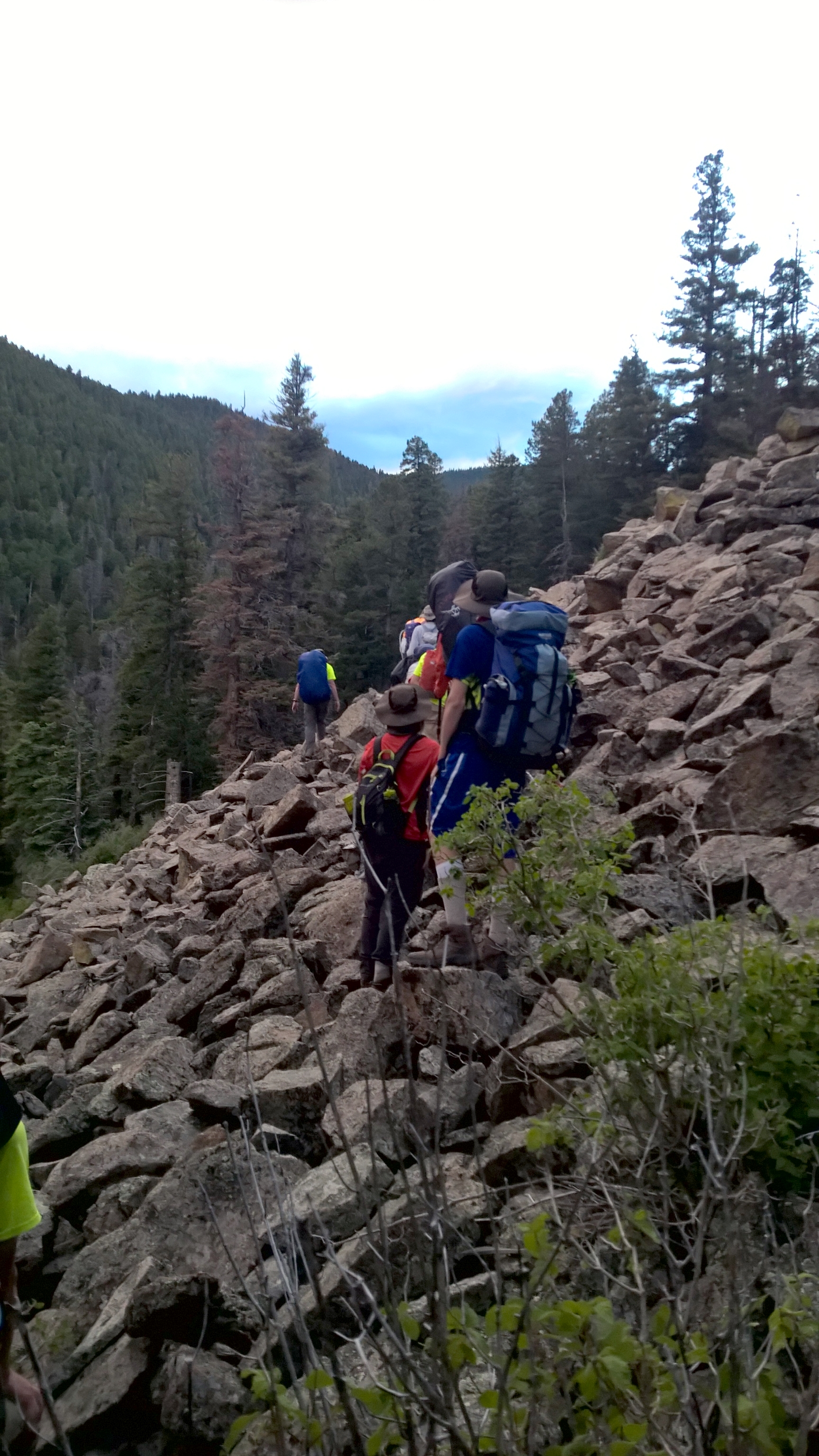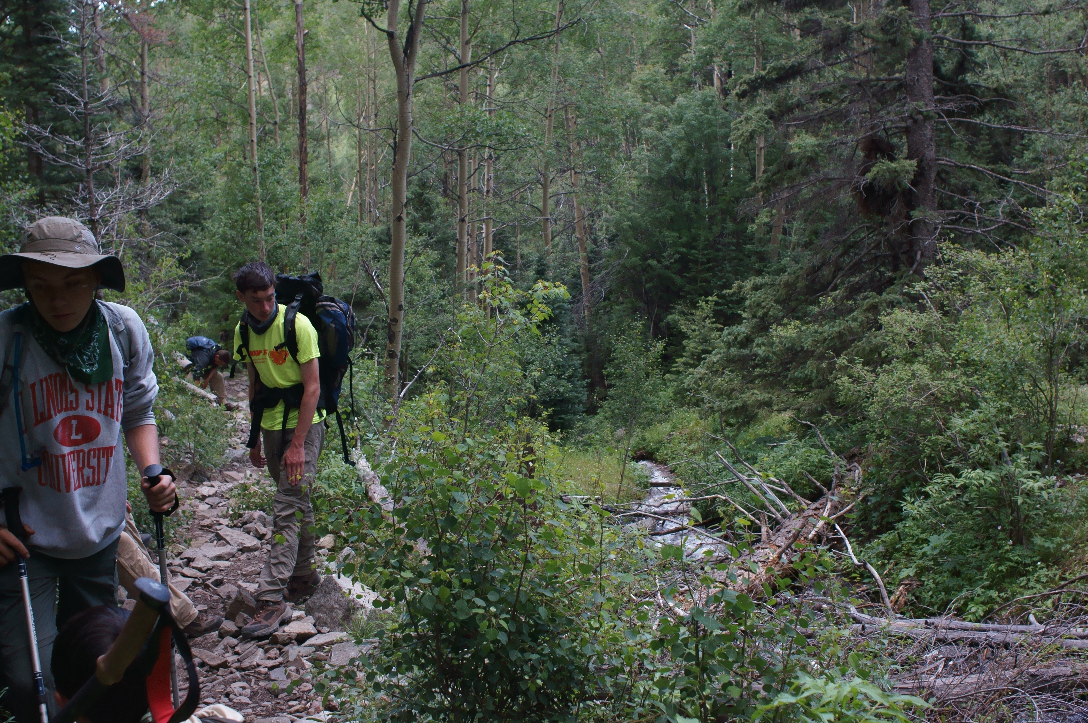 This morning the boys did the staff challenge course at Head of Dean before we left on our hike to Upper Bench. Today’s hike was one of our longest at 13.8 miles and 1484 vertical feet climbed. That does not include the downhill vertical which today caused more pain than the climbing part. We had a long decent down to the Cimarron river which was steep and rocky. When we got to the bottom we found that the trail had been washed out but the recent floods so you had to make your way down a washed out creek bed to the river. After crossing the river we climbed to the Vista Grande trail camp where crew 2 was camping for the night. Thankfully, they had lots of water treated and ready for us because we were all out after a long hike. We ate dinner together and rested up before heading on to our camp site at Upper Bench, two miles further up the trail. This camp site was the opposite of Baldy Town. We were on a flat site next to a small lake and soft ground.