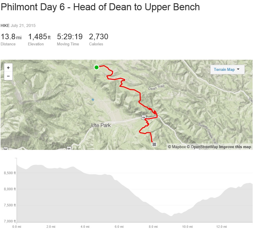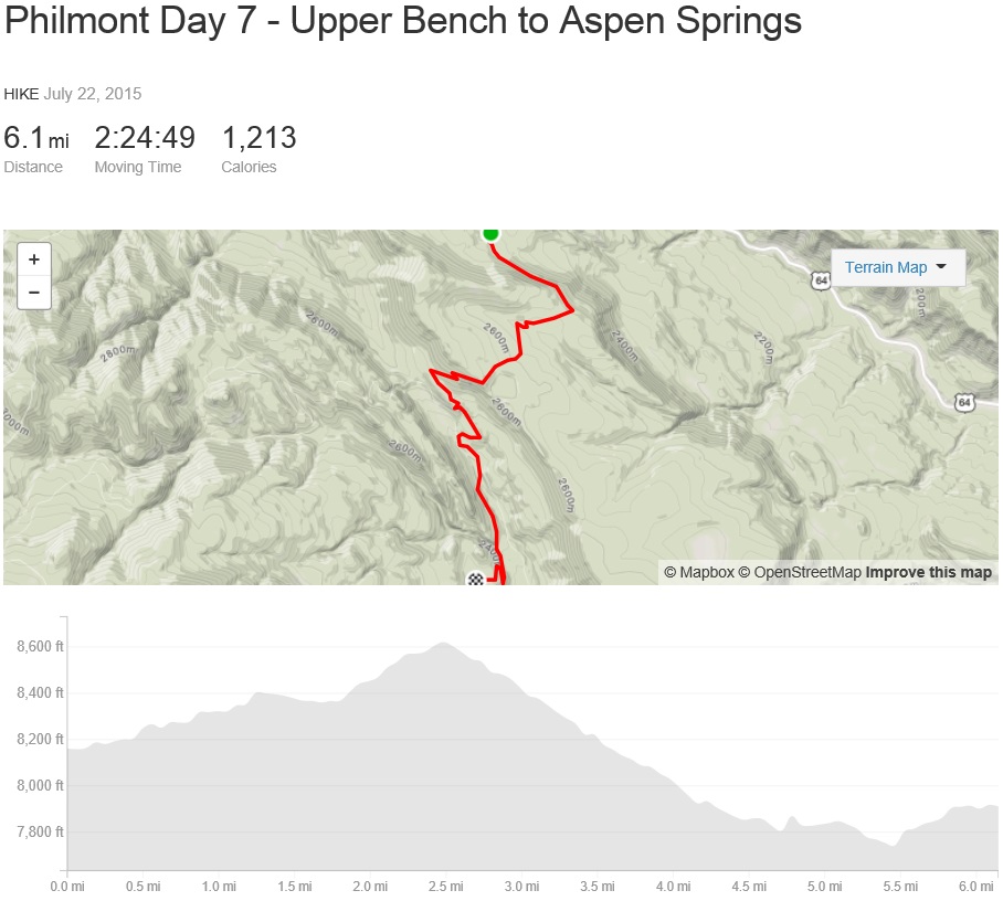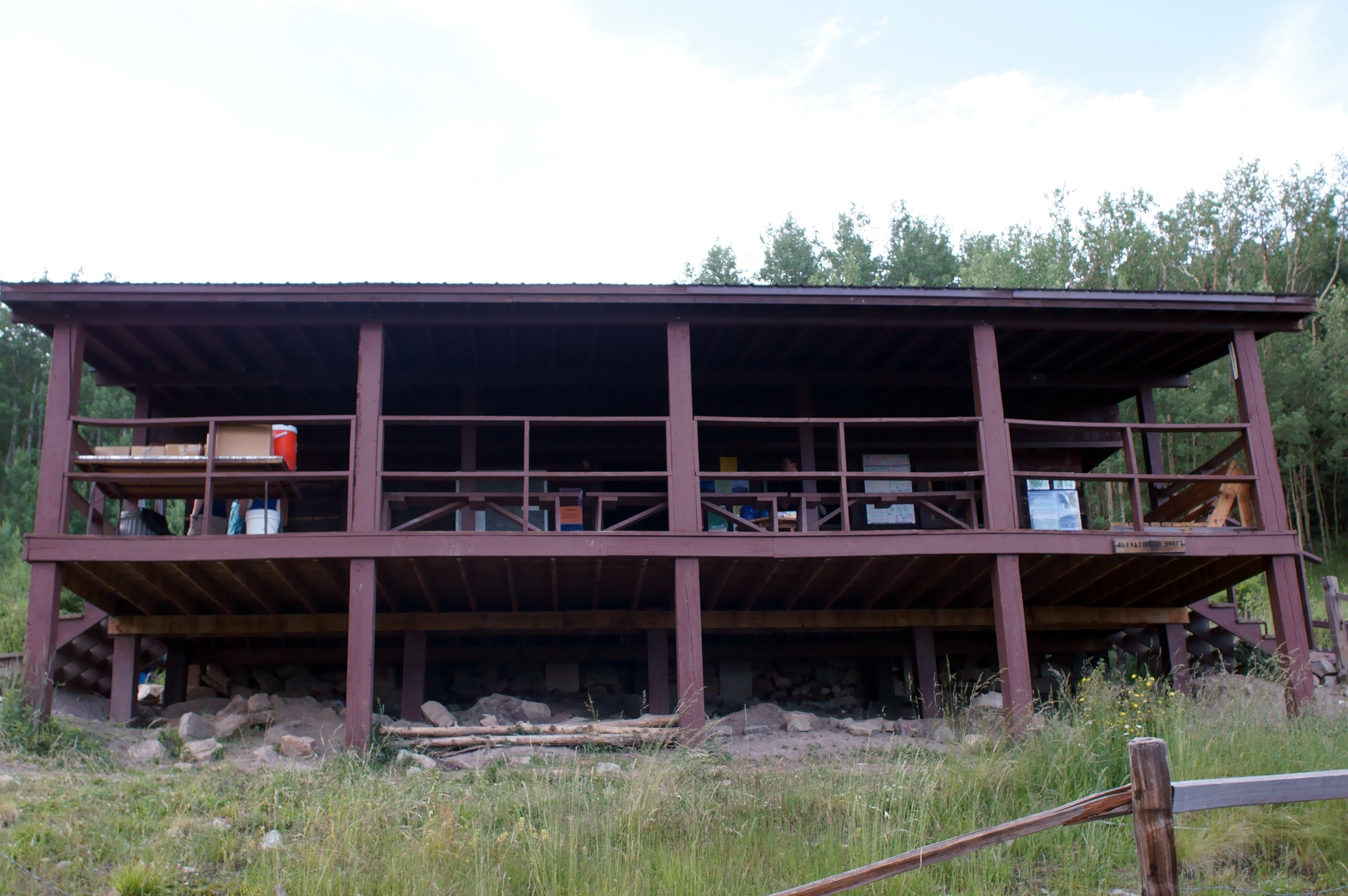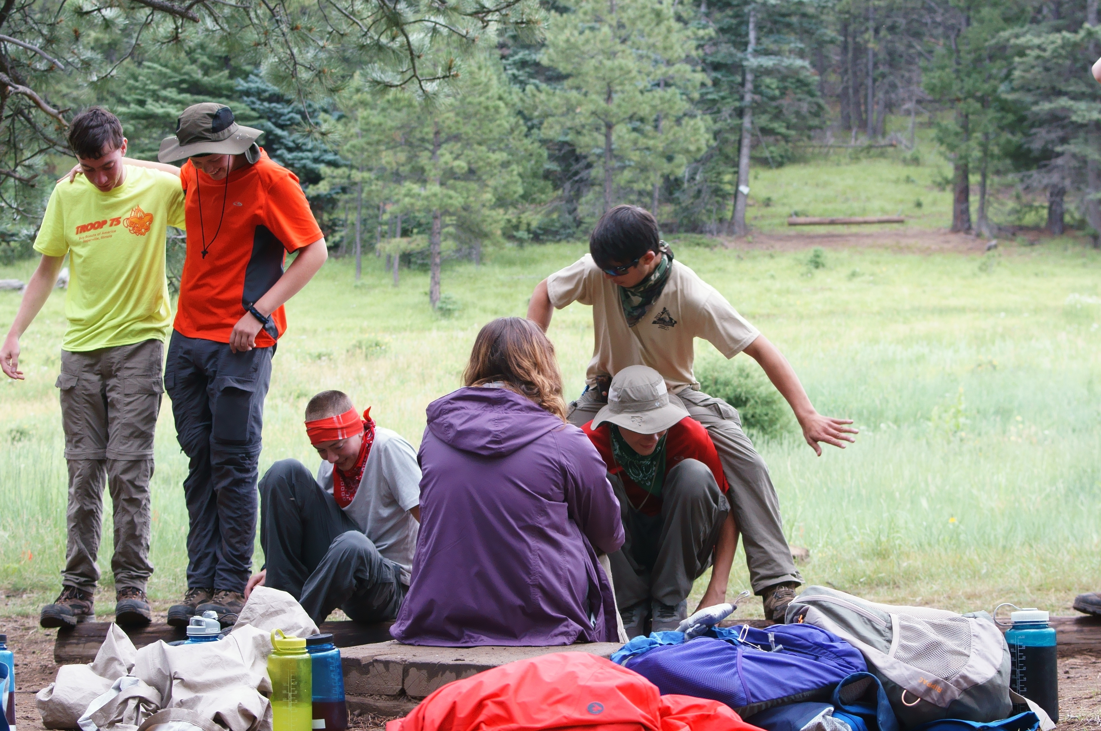 This morning the boys did the staff challenge course at Head of Dean before we left on our hike to Upper Bench. Today’s hike was one of our longest at 13.8 miles and 1484 vertical feet climbed. That does not include the downhill vertical which today caused more pain than the climbing part. We had a long decent down to the Cimarron river which was steep and rocky. When we got to the bottom we found that the trail had been washed out but the recent floods so you had to make your way down a washed out creek bed to the river. After crossing the river we climbed to the Vista Grande trail camp where crew 2 was camping for the night. Thankfully, they had lots of water treated and ready for us because we were all out after a long hike. We ate dinner together and rested up before heading on to our camp site at Upper Bench, two miles further up the trail. This camp site was the opposite of Baldy Town. We were on a flat site next to a small lake and soft ground.
