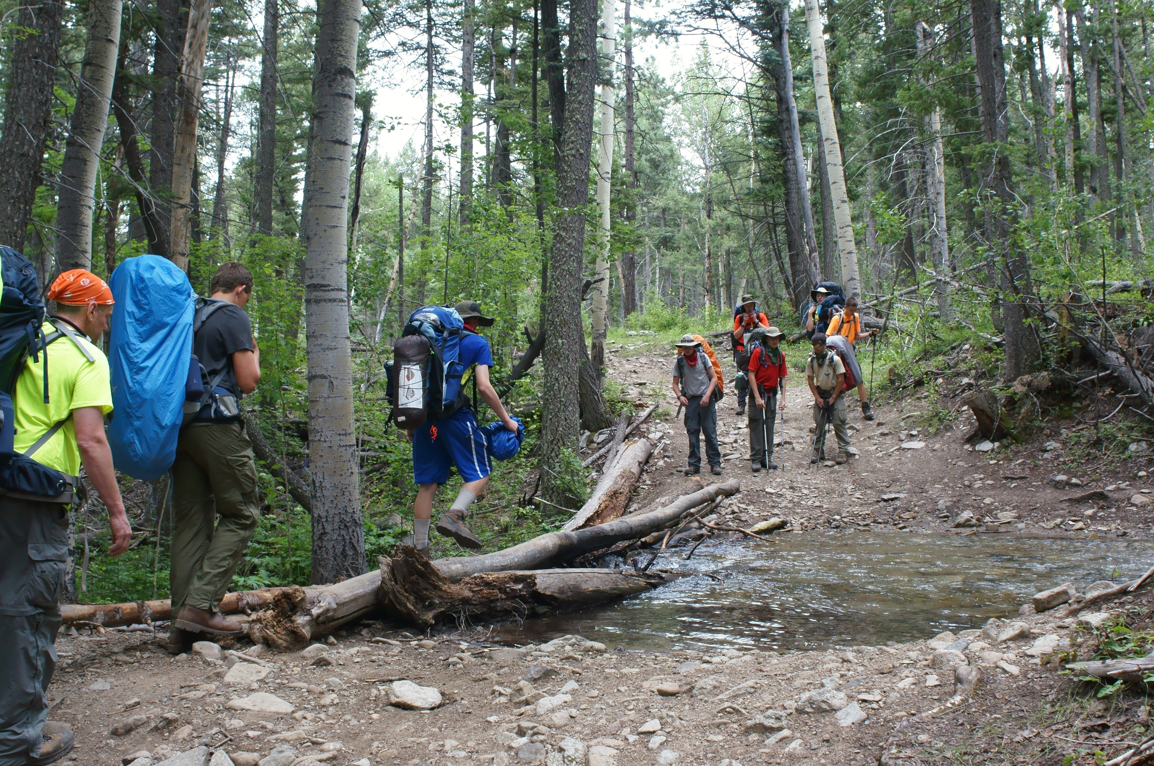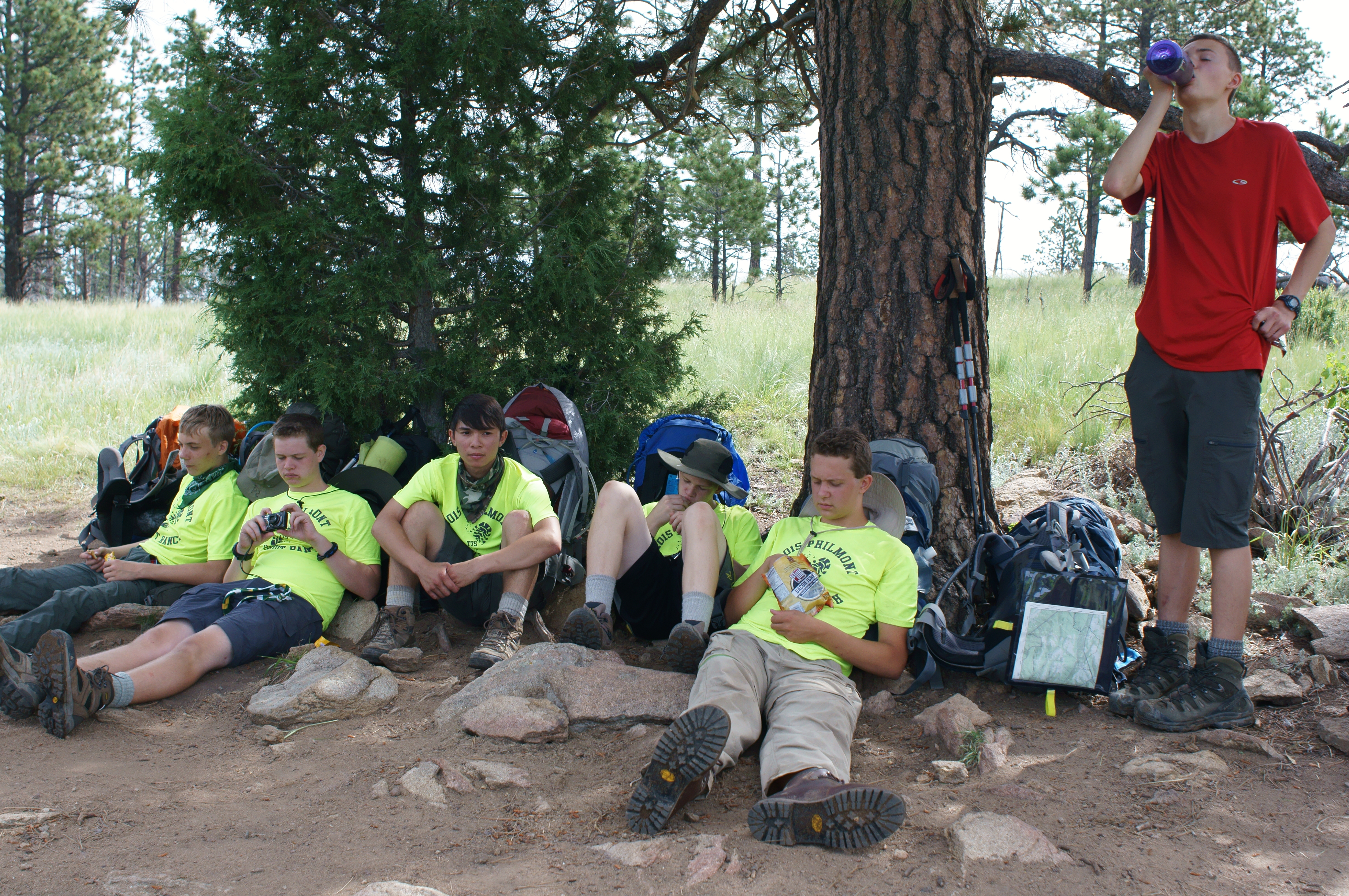 Left Aspen Springs at 7:00 AM – hiked to Cimaroncito staff camp where we dump our garbage and swapped out the food that no one wanted and picked up some stuff left by other crews. Hiked on to Hunting Lodge where Mr. Phillip’s had his hunting lodge. The boys took the tour and then we headed out to Clark’s Fork Staff camp. We took a short break at Clark’s Fork before heading up Schaefers Pass. I got a head start on the rest of the crew since I’m slower going up hill. However, the crew was slower getting started and also decided to take an alternate route i.e. the “Road” which ended up taking longer than the regular trail. Therefore I got to the top of the pass way before everyone else and had lots of time to kill. I went looking for crew 2’s stuff, they were doing the side hike to the Tooth of Time. When I found it I decided to leave Mr. Clements a little present in his backpack. When my crew finally made it to the top of the pass we started out for Miners Park, our final destination for today. Once we arrived at Miners Park we were able to take showers and do laundry. Crew 2 arrived later in the day and Mr. Clements let me know that he was very happy about the present that I left him. Tomorrow morning the boys will do rock climbing before we head to Urraca Staff Camp. Today we hiked 11.2 miles and climbed 2000 feet vertical.