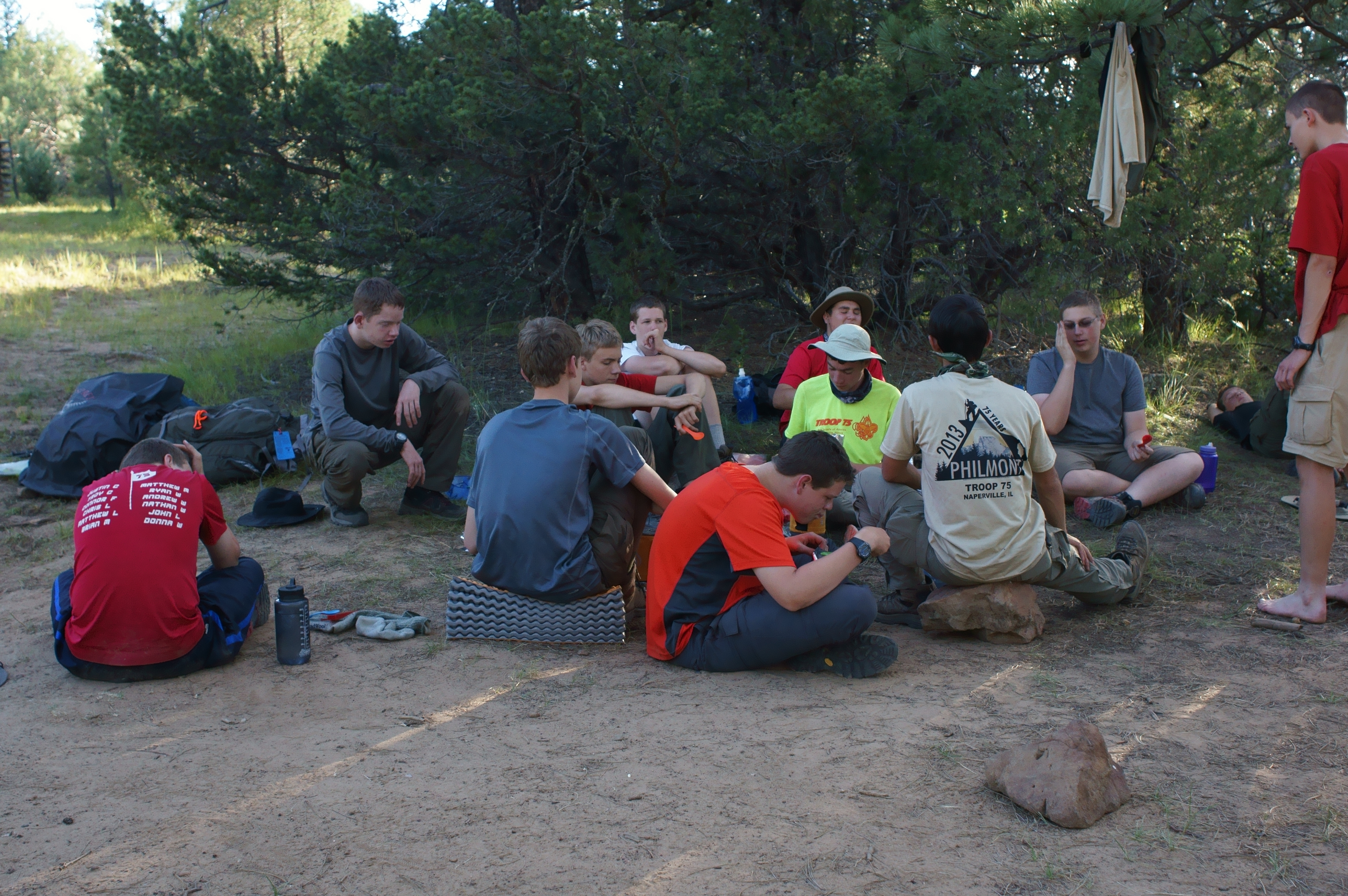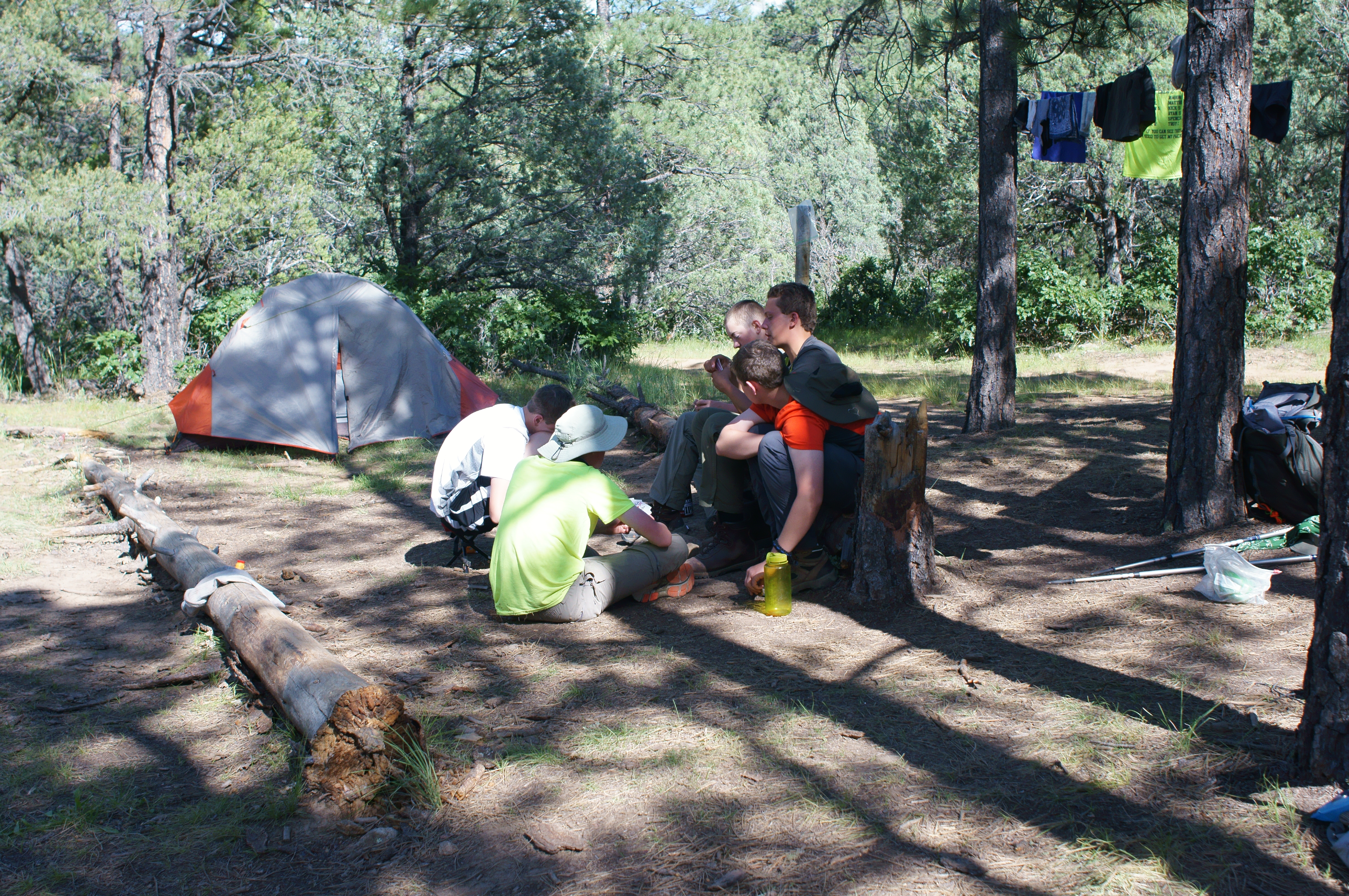 Took two hours to break camp. Hiking to Publeano staff camp today. Saw more damage from the previous month rains i.e. wash outs on the trail. We met crew 2 at the Pueblano staff camp and the boys did spar pole climbing. Then we hiked to Pueblano Ruins trail camp for the night. Later that afternoon the boys returned to the Pueblano staff camp to play Mountain Ball and attend a camp fire program. They really seemed to enjoy the staff and the program that they performed at the camp fire. Hiked 7.2 miles and climbed 1400 feet vertical today. This will be our last night with Ranger Adam. Mr. Snyder is showing signs of altitude sickness, so he may have to return to base camp to acclimate while we climb higher to Baldy Town tomorrow.