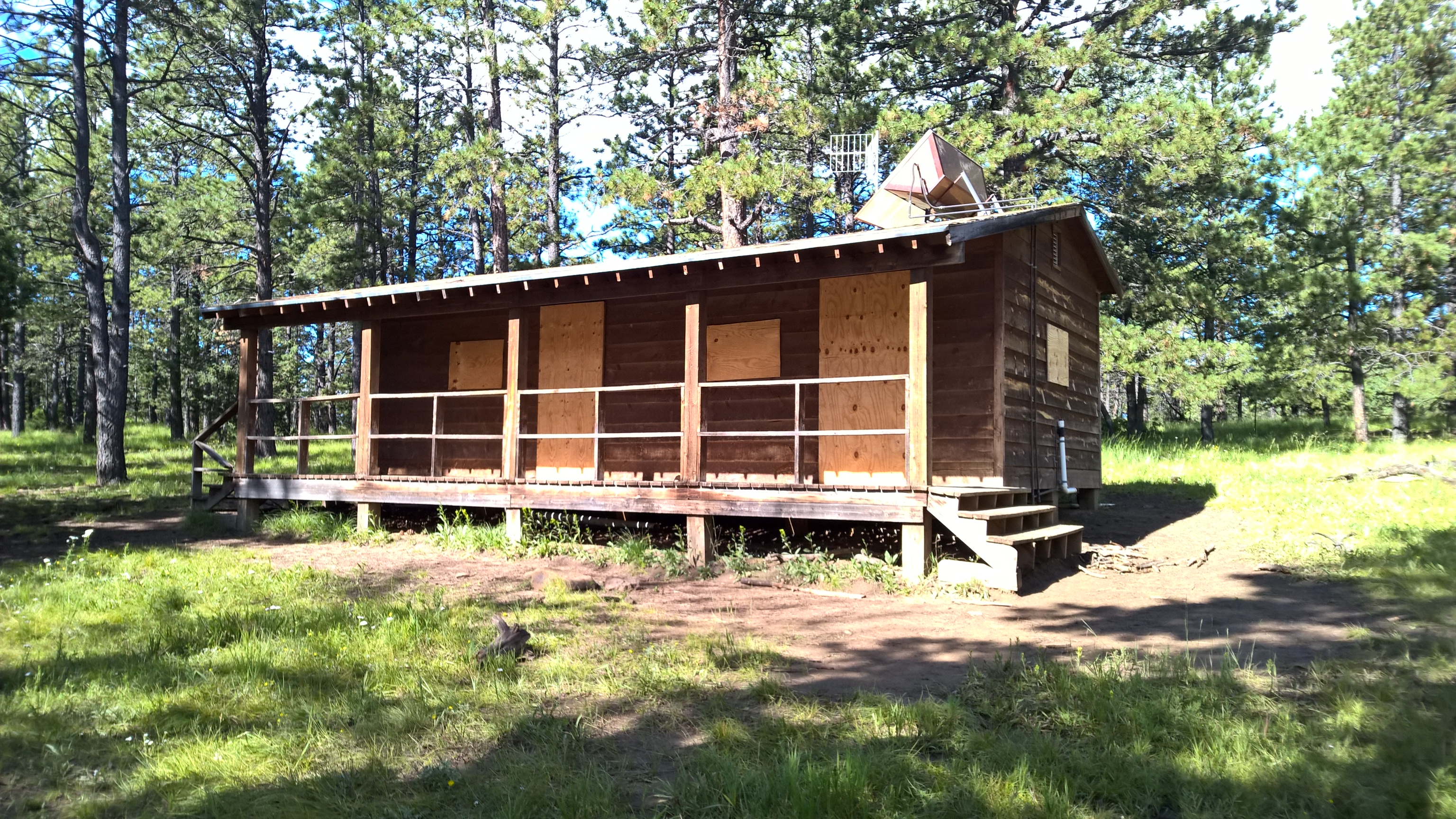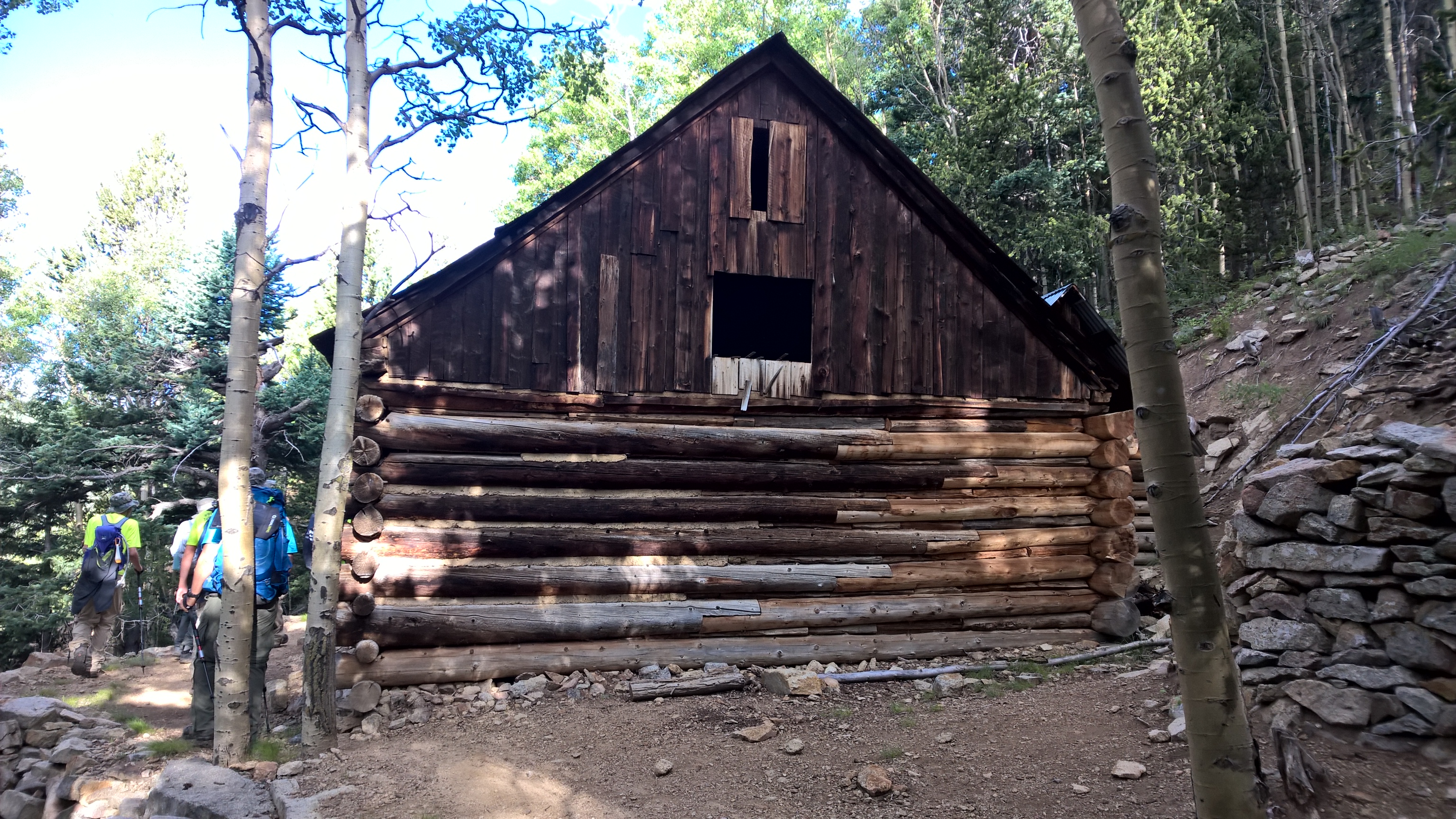 The morning went quick with wakeup and preparation for the climb to Baldy. Day packs and food packs were prepared the day before to make leaving easier in the morning. The crew left at 6 AM with hopes of getting to baldy in about 3 hours. Total climb for the day would be ~ 2700′. The hike was long and started with lots of switch backs. We did see a cabin along the way and took a group picture near the cabins: