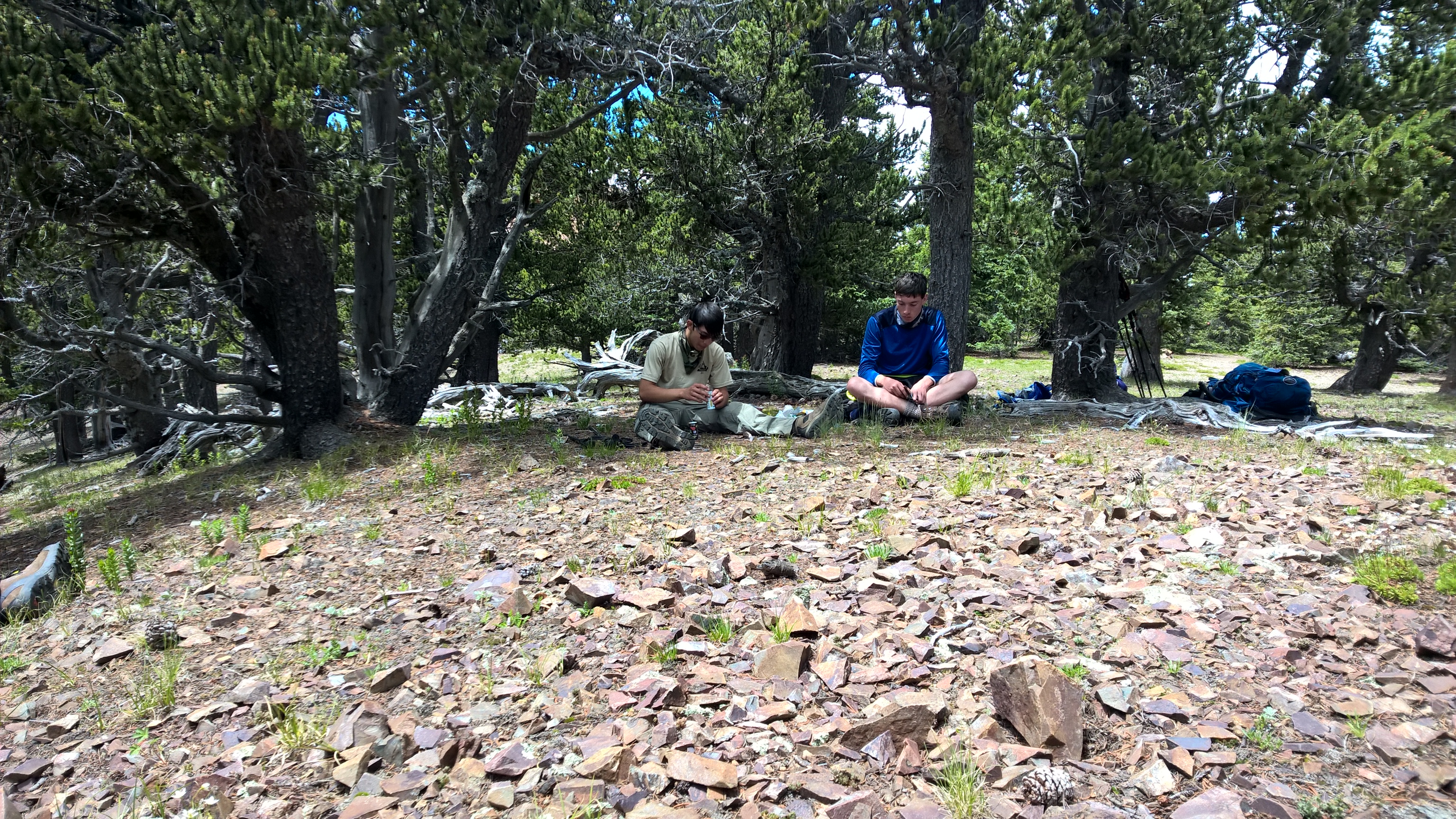 This morning we got a late start today, 10:30 am, since everyone was tired after yesterday and today’s hike is supposed to be a little shorter. We hiked thru Ute Pass to the Ute Gulch Commissary where we got resupplied with three more days of food. This is the last food pickup on our trek. Our sick scout also rejoined us at Ute Gulch after recuperating at Base Camp. We then hiked on to Aspen Springs where the boys participated in a conservation project. It basically involved moving big rocks to help rebuild a section of trail. It was a good day to do this since we only hiked 6 miles with 800 vertical feet climbed. Tomorrow will be another long day up and over Schaffer’s pass.