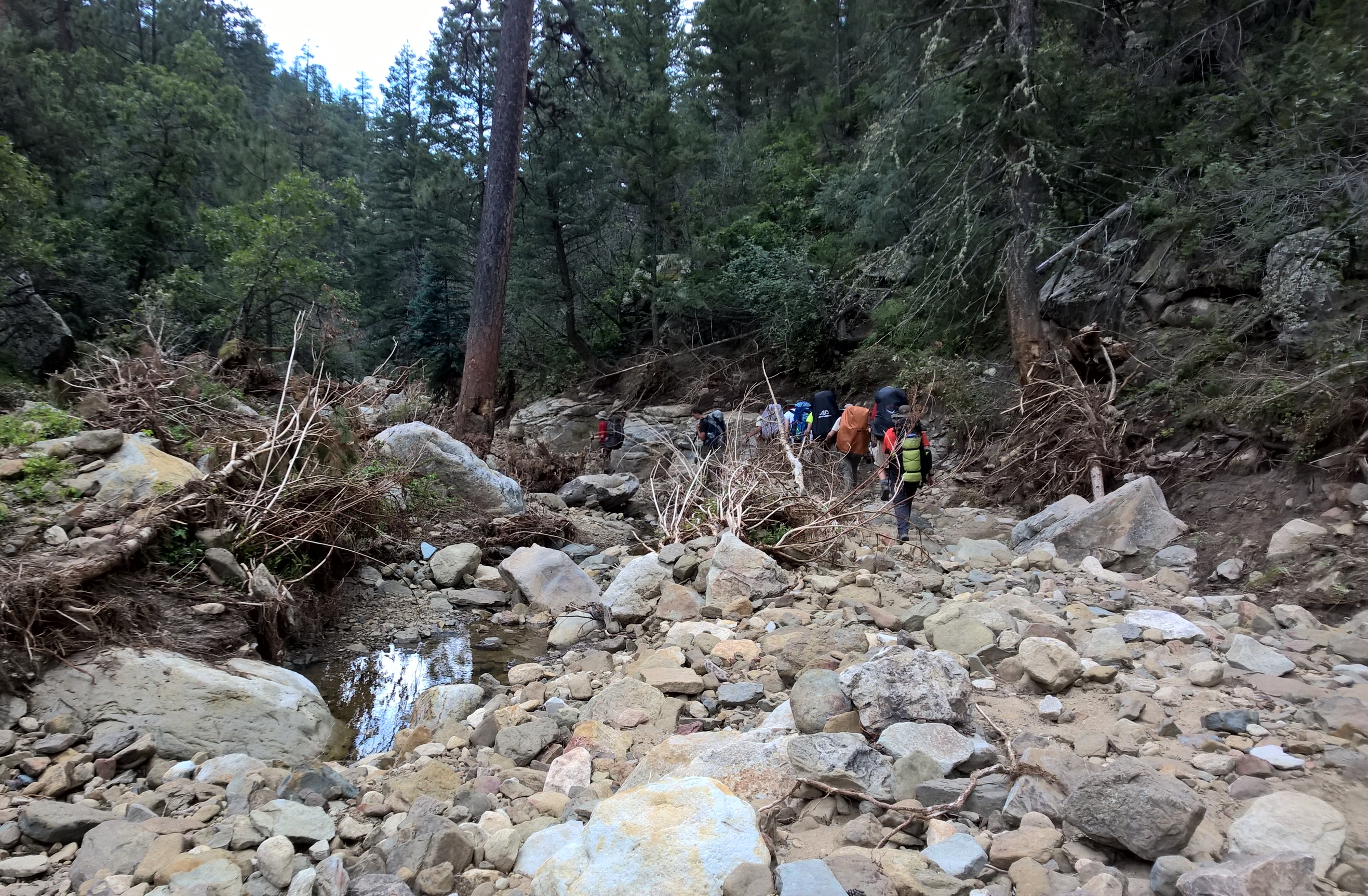 Rode Bus from Base Camp to Ponil Turnaround. Had a brief discussion with Ranger Adam on orienteering and trail etiquette before hitting the trail. The damage of the previous months flash floods is still obvious in the canyons. Lots of flood debris all around. Shocking to see how high the flood waters were.